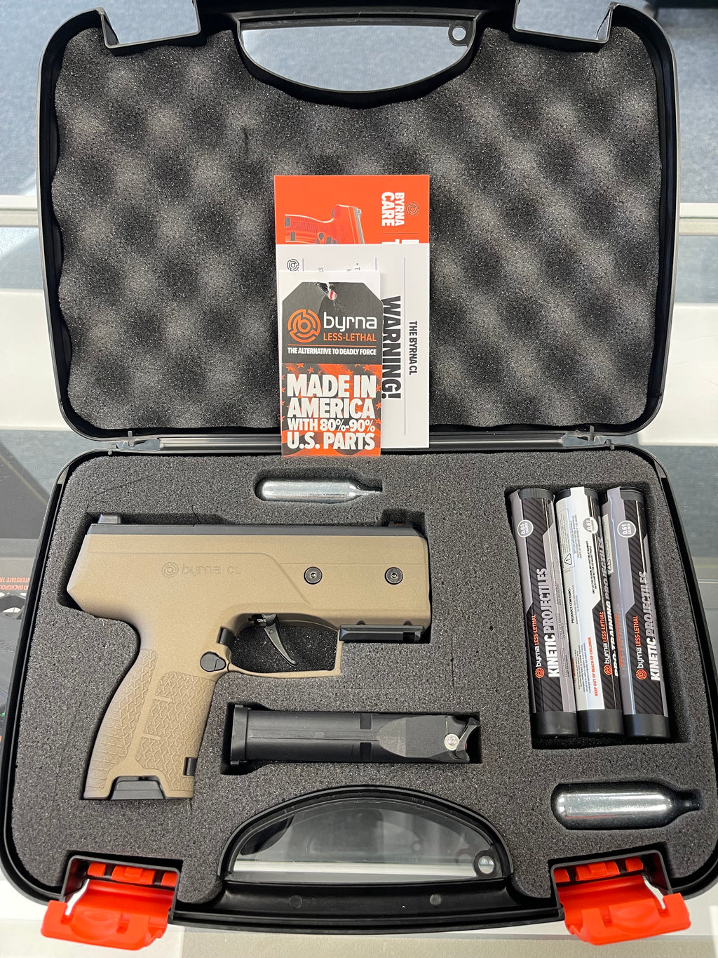The Byrna CL (Compact Launcher) is the most compact less-lethal launcher in the world. The entire platform has been reimagined for maximum concealability and stopping power. Powered by compressed air (CO2), the Byrna CL shoots .61 caliber round kinetic and/or chemical irritant projectiles that can disable a threat from up to 60-feet away.